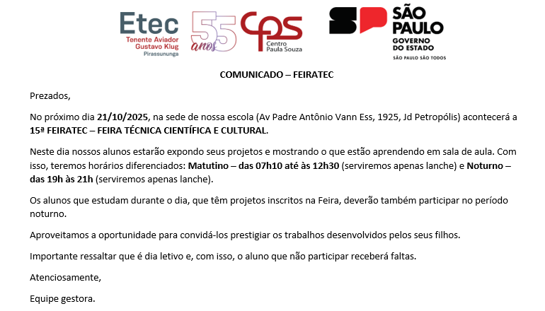 A Feiratec da Etec Tenente Aviador Gustavo Klug é um evento anual de grande importância para a comunidade local e regional. A feira tecnológica é o momento em que estudantes e professores apresentam seus projetos, inovações e pesquisas nas áreas de tecnologia, ciências, negócios e comunicação, mostrando todo o talento e criatividade que existe dentro da escola.
